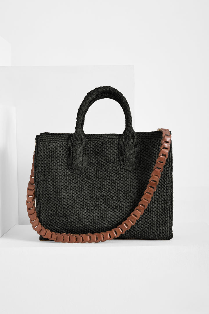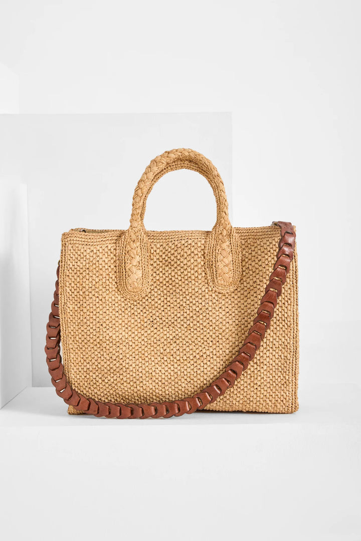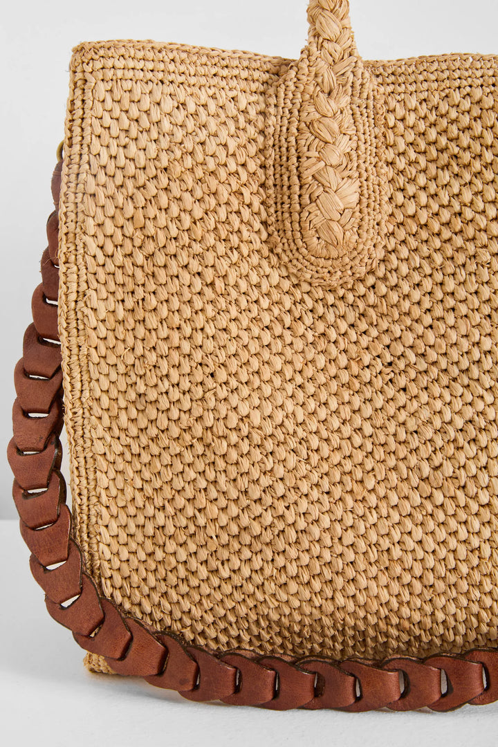 - Features: Magnetic snap closure. Removable shoulder strap in cascading braided leather and braided RAFFIA handles. Two interior patch pockets.