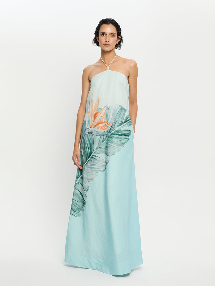 Strapless and softly structured, the Cassia Maxi Dress features a halter tie that can be left undone or fastened with intention. Its form-skimming bodice gives way to a fluid hem, offering movement without excess. The ombré base sets the tone for vivid bird-of-paradise blooms — bold, yet balanced. Designed for sun-drenched afternoons and considered evenings, Cassia carries presence with quiet conviction.