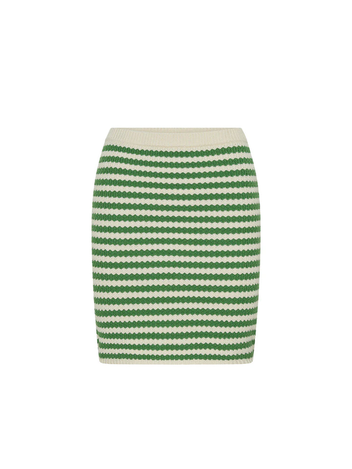 The Corinne Knit Mini Skirt is crafted in a soft green and cream stripe knit, featuring an elasticated waistband and a ribbed hem for subtle structure and comfort.