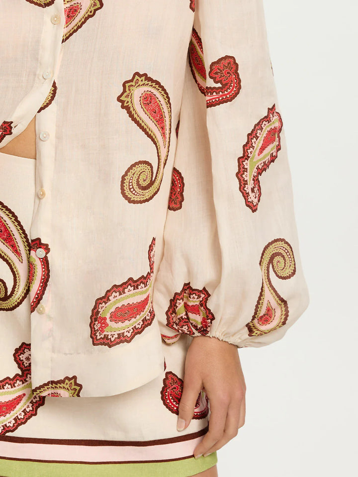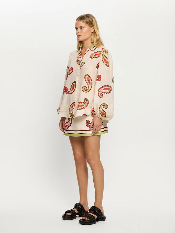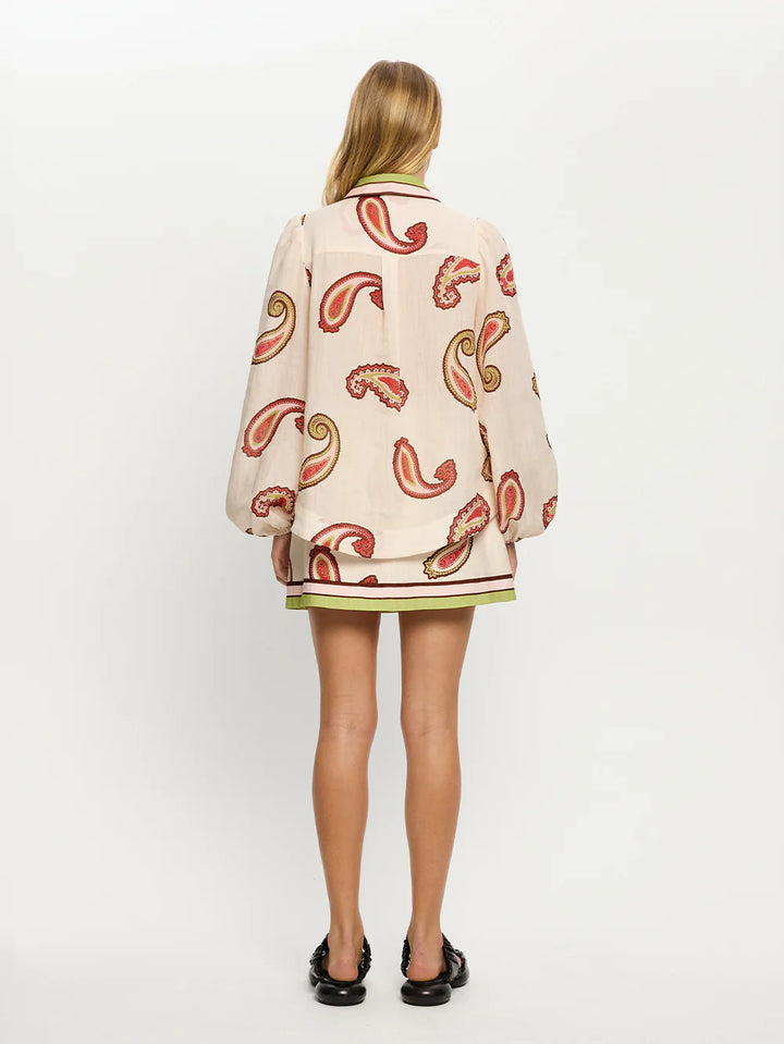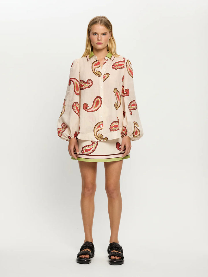 Eden is a vibrant paisley print featuring intricate motifs in red, pink, and green tones set against a light neutral base. The Eden Shirt is a relaxed silhouette featuring blouson sleeves and a button-through front, framed with a lime green band with contrast stripe at the collar. Style with the matching Eden Mini Skirt for a coordinated look, or pair with denim for a more refined look.