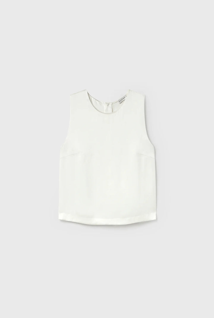 Silk Laundry Elena Top, made from 100% silk. Sleeveless, featuring a round neckline and bodice darts. Finished with button-down back.