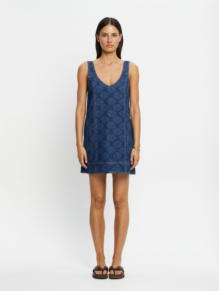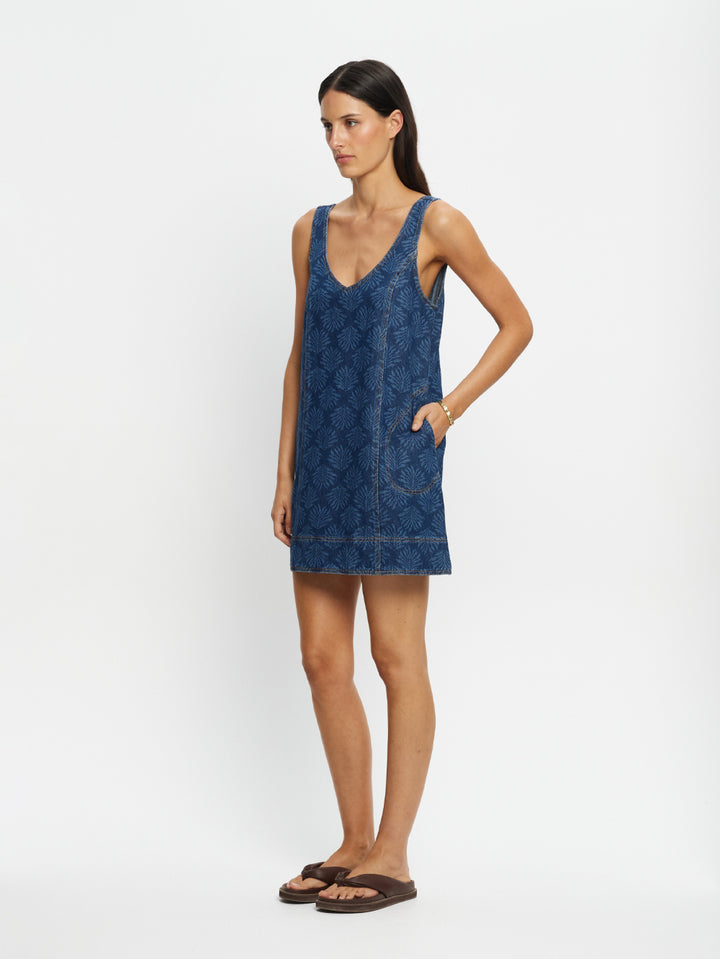 The Ilaria Denim Mini Dress is a relaxed shift silhouette, crafted in a printed coral design. Featuring contrast topstitch detailing, panel seams and front pockets, this effortless style combines laid-back ease with elevated detailing. Elevate with heeled sandals for warm evenings or long lunches in the sun.