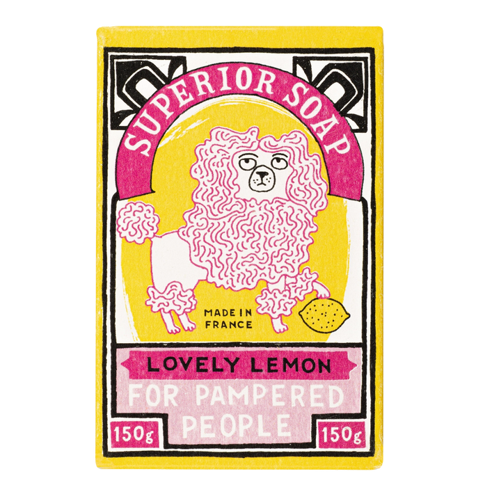 The Savon d'Archivist lemon scented yellow soap embossed with a poodle, in bold yellow decorative packaging that features a grumpy poodle.