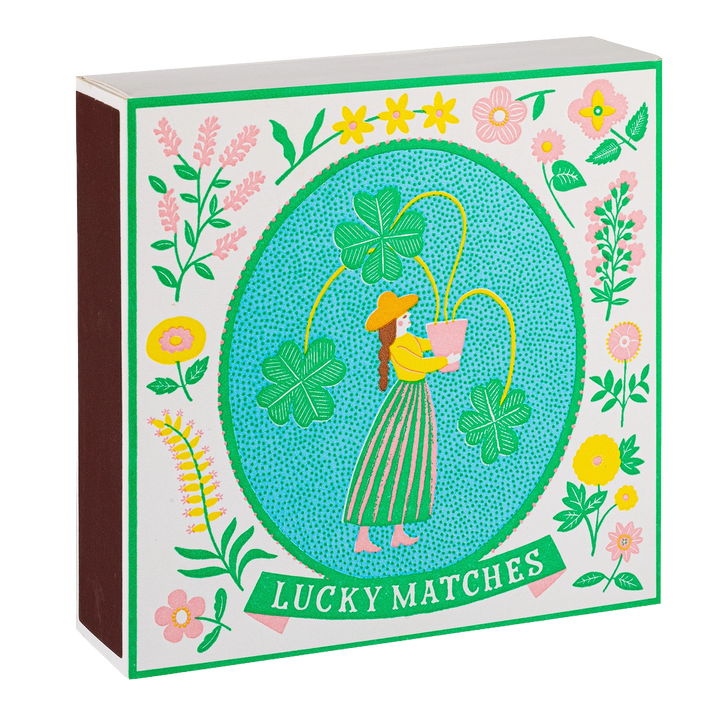 The signature square matchbox featuring a vintage cross-stitch inspired four-leaf clover design with a woman in the centre surrounded by romantic floral details with the words 'Lucky Matches.'