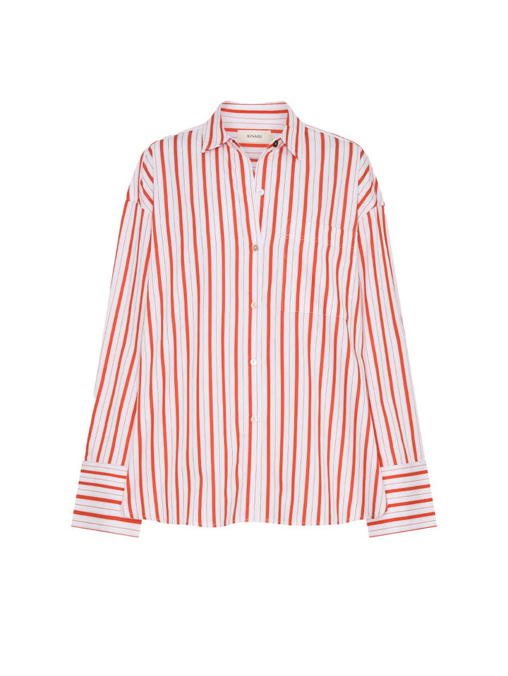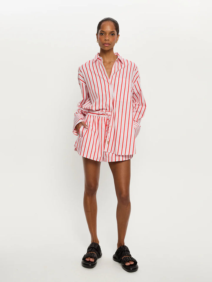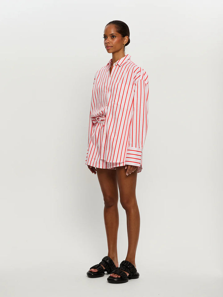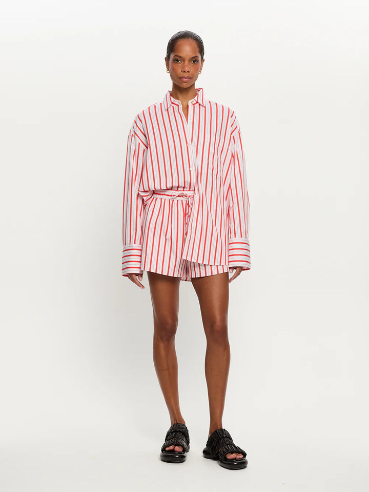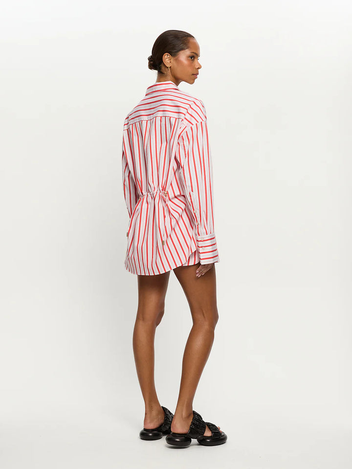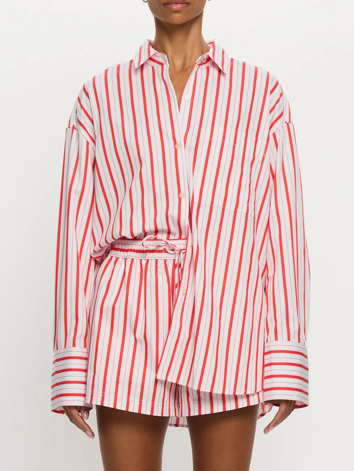 The Maddie Shirt is crafted in a soft pink and red stripe on a crisp white base. The Maddie Shirt is a relaxed fit featuring a classic collar, signature buttons, long sleeves with elongated cuffs, and complete with an adjustable drawcord at back waist.