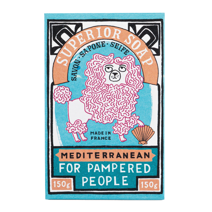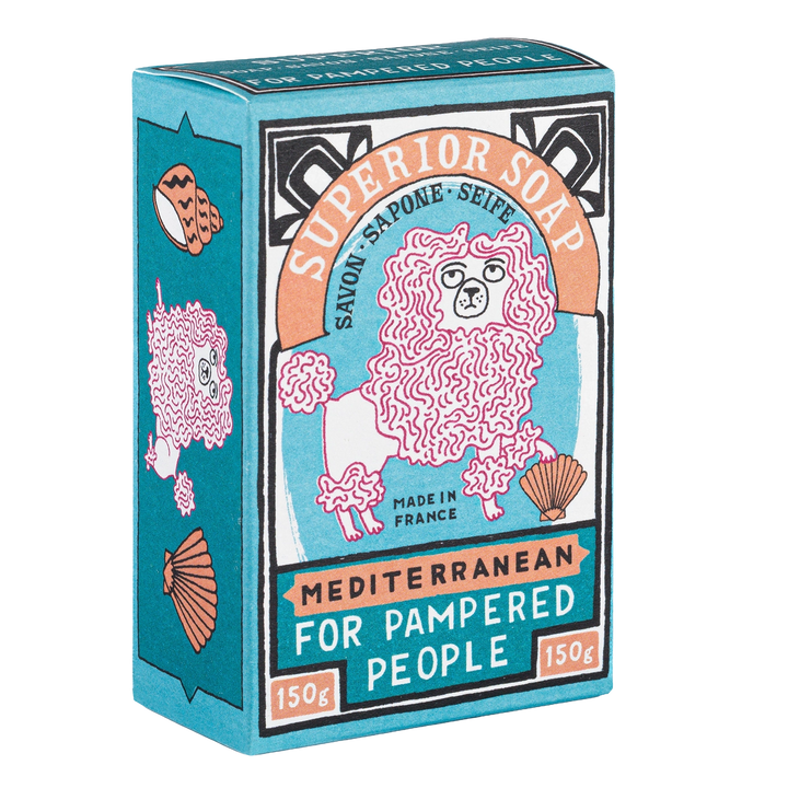 The Savon d'Archivist mediterranean scented blue soap embossed with a poodle, in bold blue and peach decorative packaging that features a grumpy poodle.