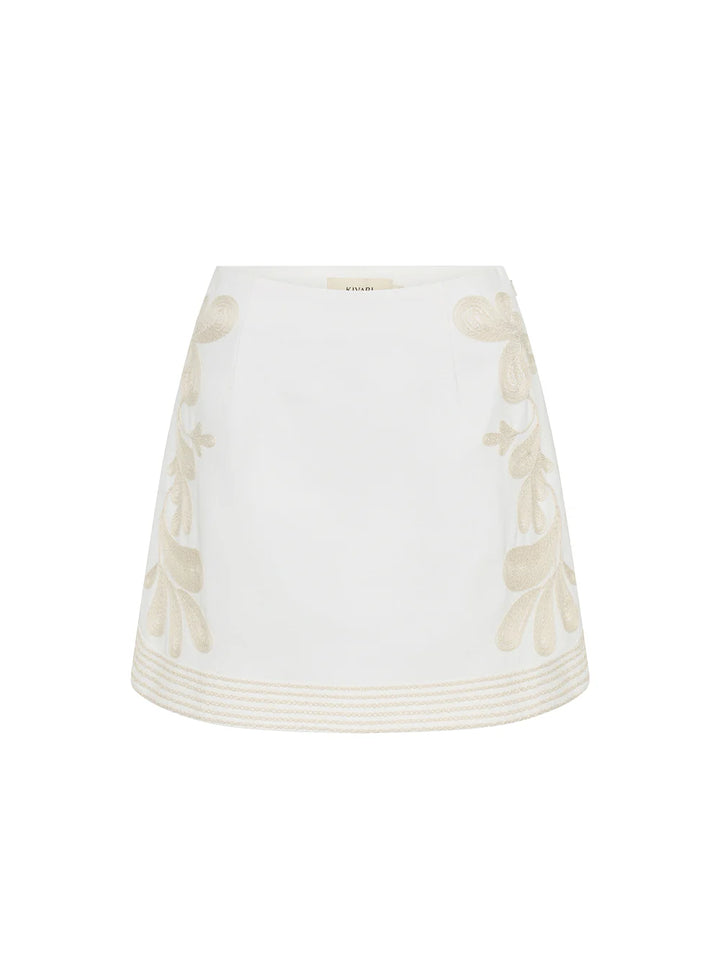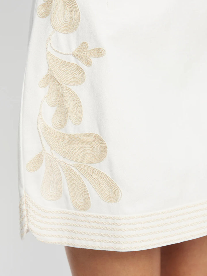 The Moni Mini Skirt features an A-line silhouette with a curved hemline, finished with intricate cream floral embroidery across the centre and hem. Style with the matching Moni Top for a coordinated look, or pair with a Tallulah tank and sandals for weekend outings.