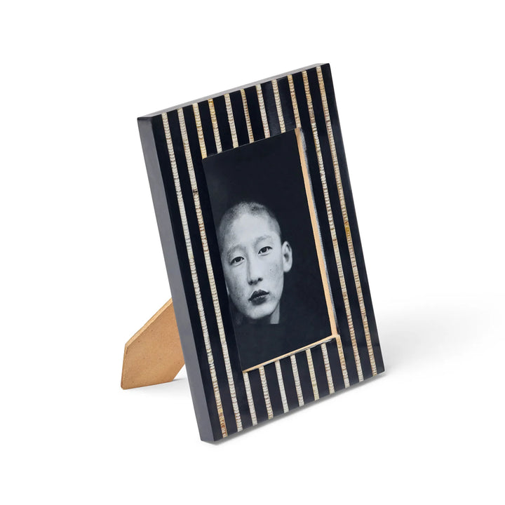 The Omari Photo Frame 4x6. This striking design is handcrafted from black resin with hand-etched inlaid horn stripe. With outer dimensions of 21x16x1 cm, this frame is made to fit your 4x6" images. This piece is expertly hand crafted & each will have its own unique characteristic.