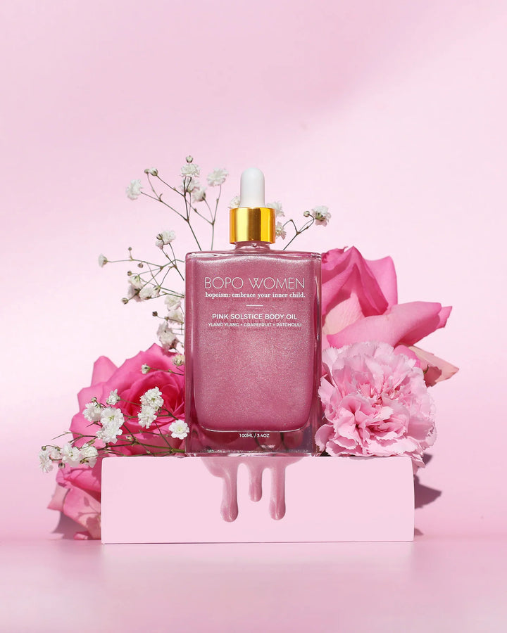 The Summer Solstice Body Oil has been Barbie-fied and is now available in this gorgeous pink shimmer version. It keeps the same delicate floral scent that you know and love, with beautiful ylang ylang, grapefruit, mandarin and sweet orange essential oils. Deeply hydrates skin while leaving a pearlescent, illuminated soft glow that works well with all skin types. Can also be used in the bath. Make sure to regularly shake this product before use to get the most out of it's glittery magic.