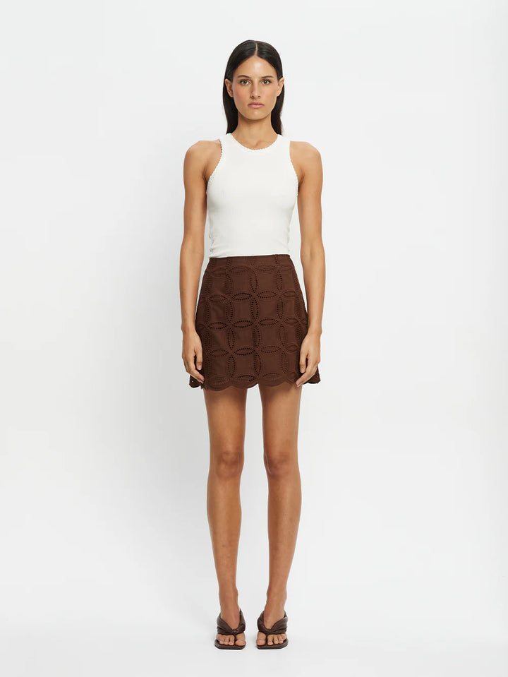 The Rio Skirt in brown is crafted from 100% cotton broderie, featuring a high waist, scalloped edging along the hemline and invisible back zip for a seamless finish. Style with the matching Rio Shirt for a coordinated look, or pair with a simple tank and sandals for weekend outings and coastal escapes.