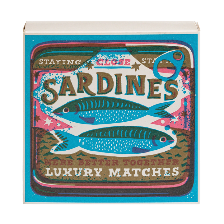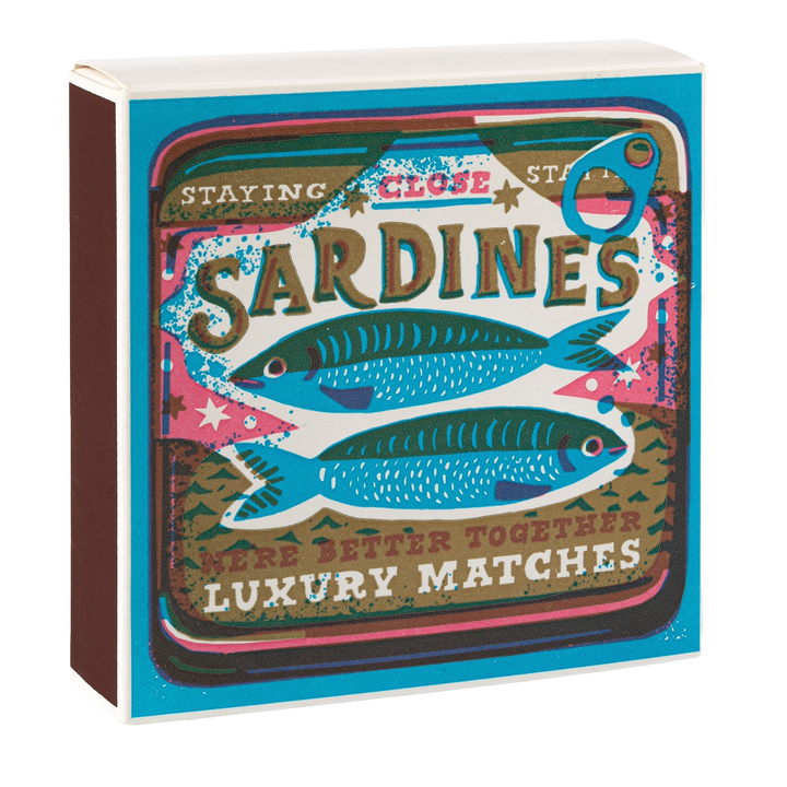 The signature square matchbox featuring a tin with two sardines on the front in pinks and blues, along with the words 'Sardines, We're Better Together, Luxury Matches.'
