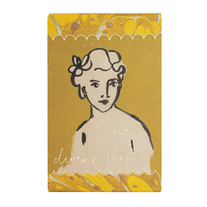 The Savon d'Archivist shea butter scented cream soap embossed with the divine lady by Wanderlust, in yellow packaging featuring the same figure.