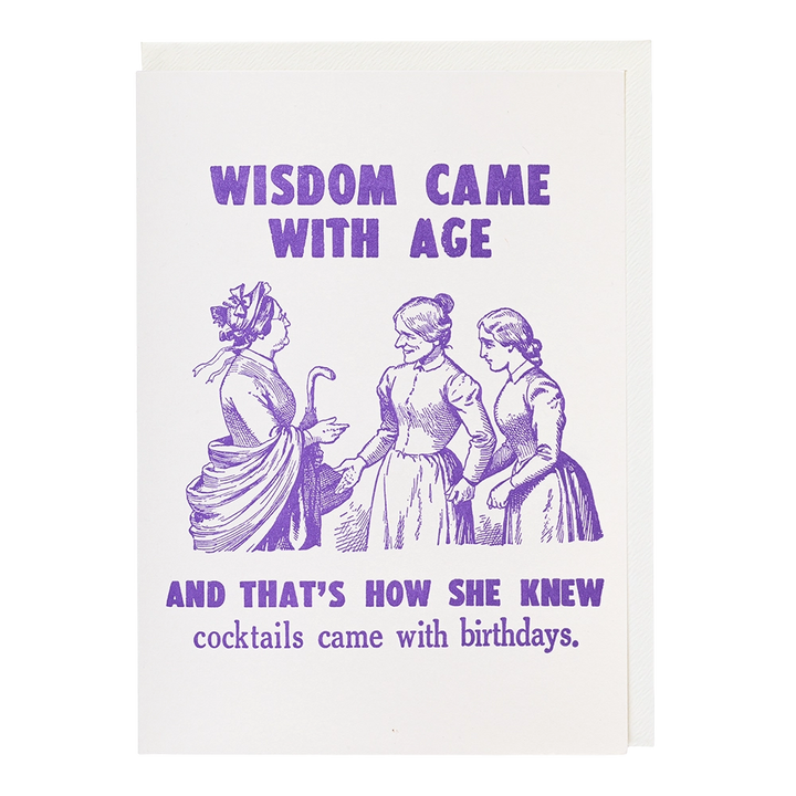 The letterpress greetings card featuring a purple illustration of three women talking with the words 'Wisdom came with age, and that's how she knew cocktails came with birthdays.'