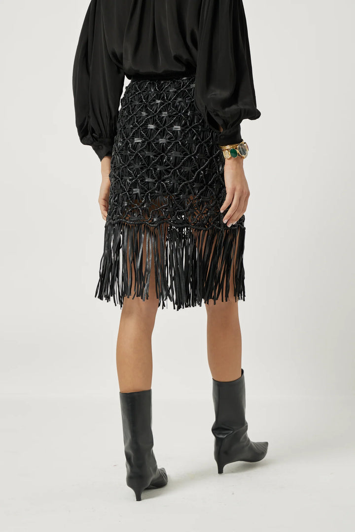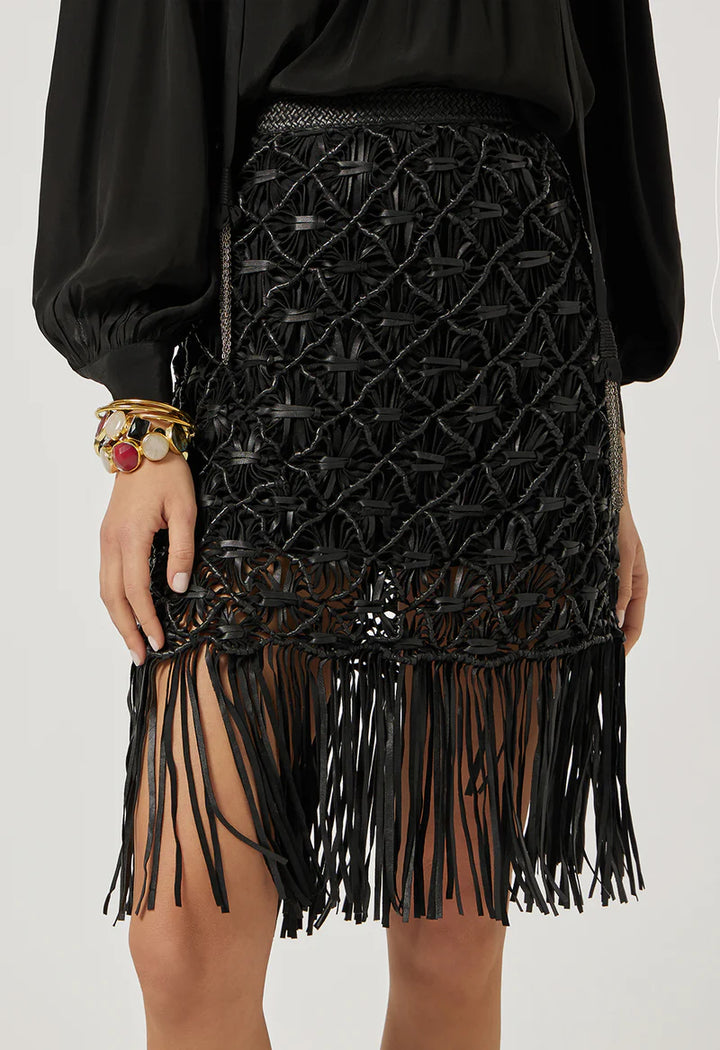 Transform your style with the WIWI SKIRT, a bold and luxurious piece. Fully lined for comfort, this mini skirt features an intricate all over Macramé handwork pattern. Leather fringes at the bottom hem add a playful and edgy touch making it a perfect fusion of sophistication and statement style.
